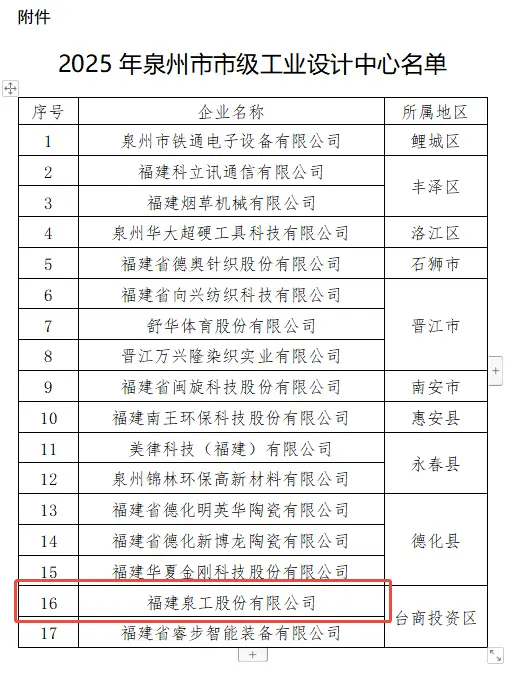 近日,泉州市工业和信息化局正式发布了《关于公布2025年泉州市市级工业设计中心名单的通知》,全市共有17家企业上榜。其中,深耕智能砖机与固废综合利用装备领域的365博彩官网凭借在工业设计创新、研发体系建设及成果转化等方面的突出表现成功入选。