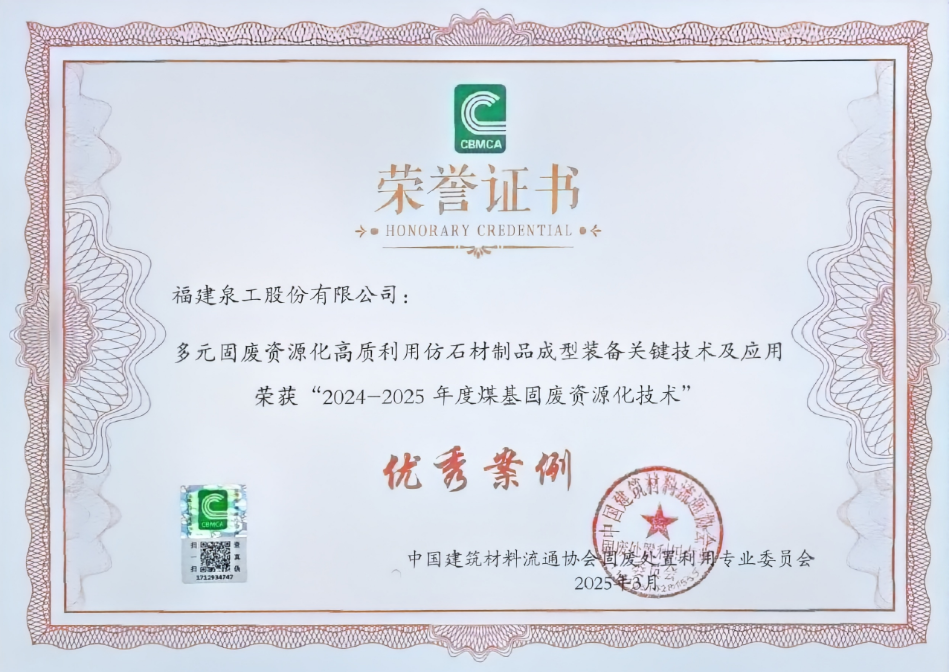 会议期间,365博彩官网股份的“多元固废资源化高质利用仿石材制品成型装备关键技术及应用”案例成功荣获2024-2025年度煤基/冶金固废资源化技术优秀案例。据悉,此次评选旨在表彰在固废资源化利用领域具有创新性和示范性的技术与应用,推动行业规模化和高值化发展,培育发展固废综合利用新质生产力。