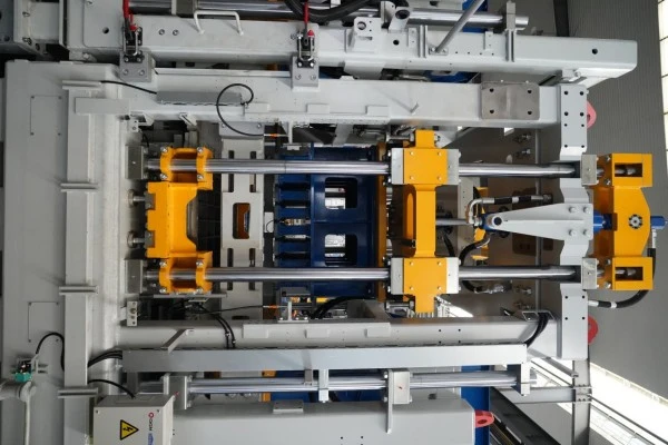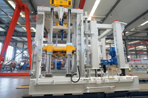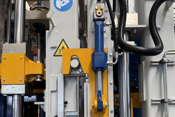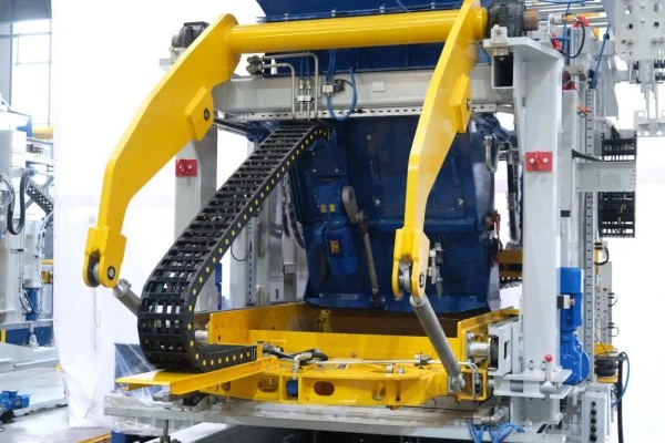 9 压头锁紧装置 压头锁紧装置是一个机械式锁紧结构,由高强度锁块、楔形压头及双作用油缸组成。脱模时,油缸先驱动锁块径向夹紧压头,形成机械死点锁止;随后模具在保持恒定压力下缓释脱模,可有效消除弹性回弹与微位移,确保砖体棱角完整、表面无拉伤,成品合格率大大提升。