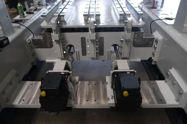 8 面料机液压自动锁紧功能 ZN900-2的主机与面料机的连接是通过一个先进的液压自动锁紧功能来实现的,油缸驱动锁紧部件,将面料机与主机紧密的连接在一起。在面料机需要拉开的时候,该装置则松开连接,减速电机驱动面料机在轨道上运行。