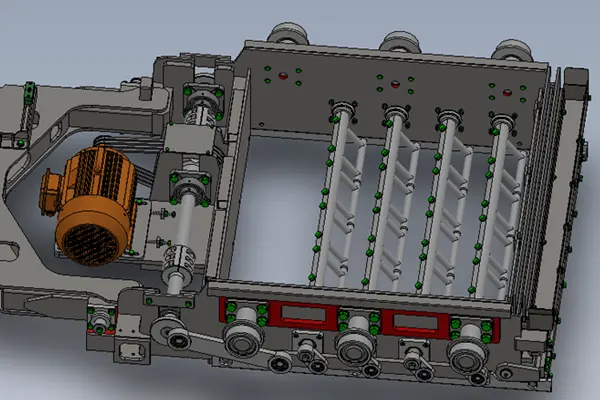 4 悬挂式布料技术 悬挂式布料系统采用的是模块化设计,集成了包换料框,刮料,压头刷,破拱装置。面料与底料的布料框装配与布料装置架上,可以实现快速更换,实现布料的最优化。